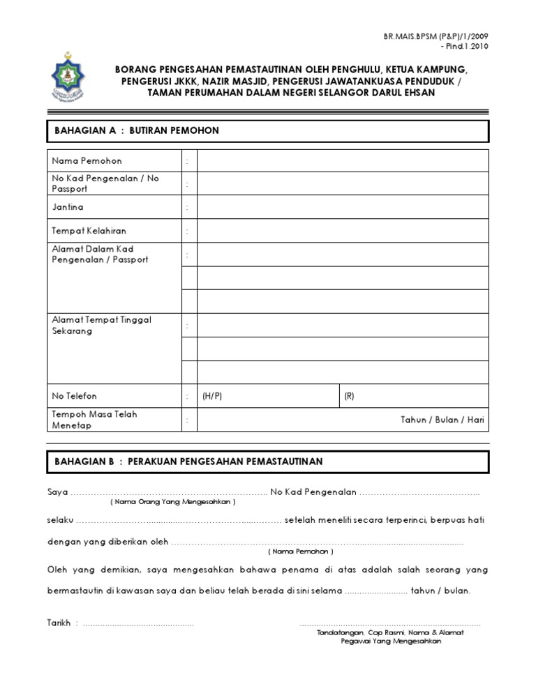 Borang Pengesahan Pemastautinan Oleh Penghulu. Pentadbiran setiausaha kerajaan negeri selangor. Pemohon perempuan hendaklah mengisi dua salinan Borang 1.